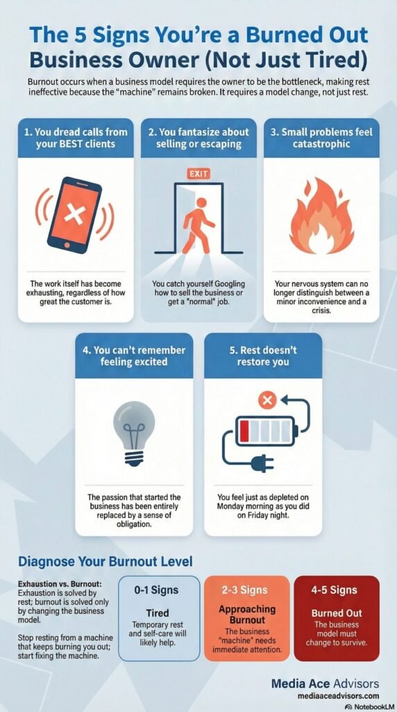 Generic burnout articles list symptoms like “feeling tired” and “losing motivation.” Those apply to everyone. Here are the five signs specific to business owners that tell you this is burnout, not just a rough week.