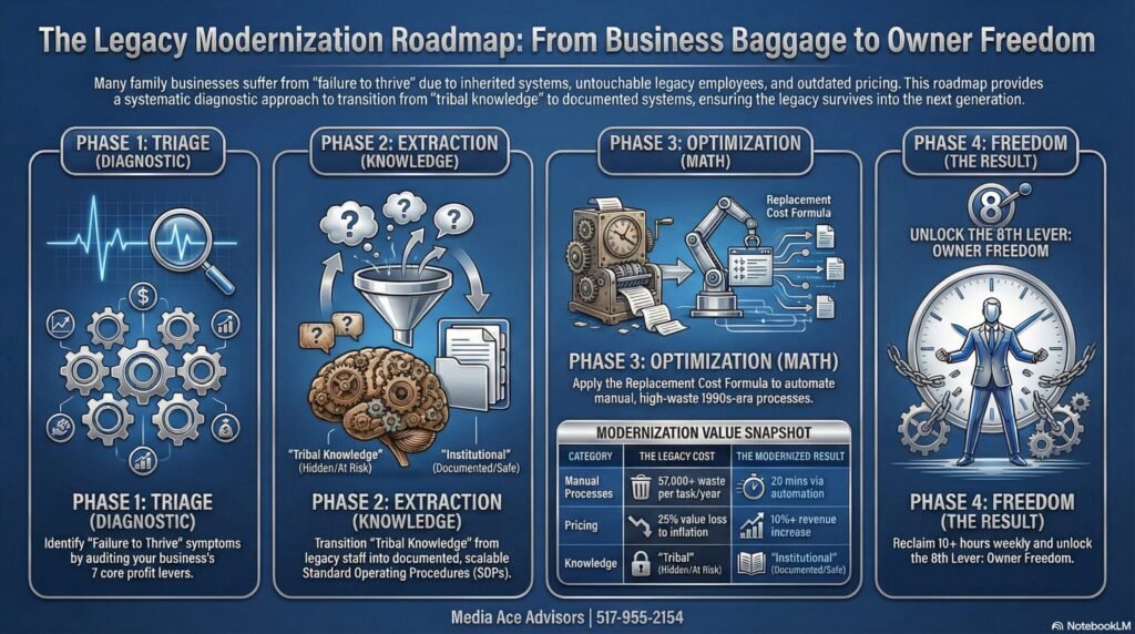 That’s exactly what I see in family businesses every week. The revenue looks fine. The customers keep coming. But underneath, the profit structure is riddled with inherited waste that nobody has been authorized to clean out. I’m Ryan Herrst with Media Ace Advisors, a Certified Profit Advisor and author of “Profit Foundation.” My healthcare background trained me to diagnose systematically: look at the vitals, ask structured questions, find root causes, prescribe treatment. I bring that same approach to business.