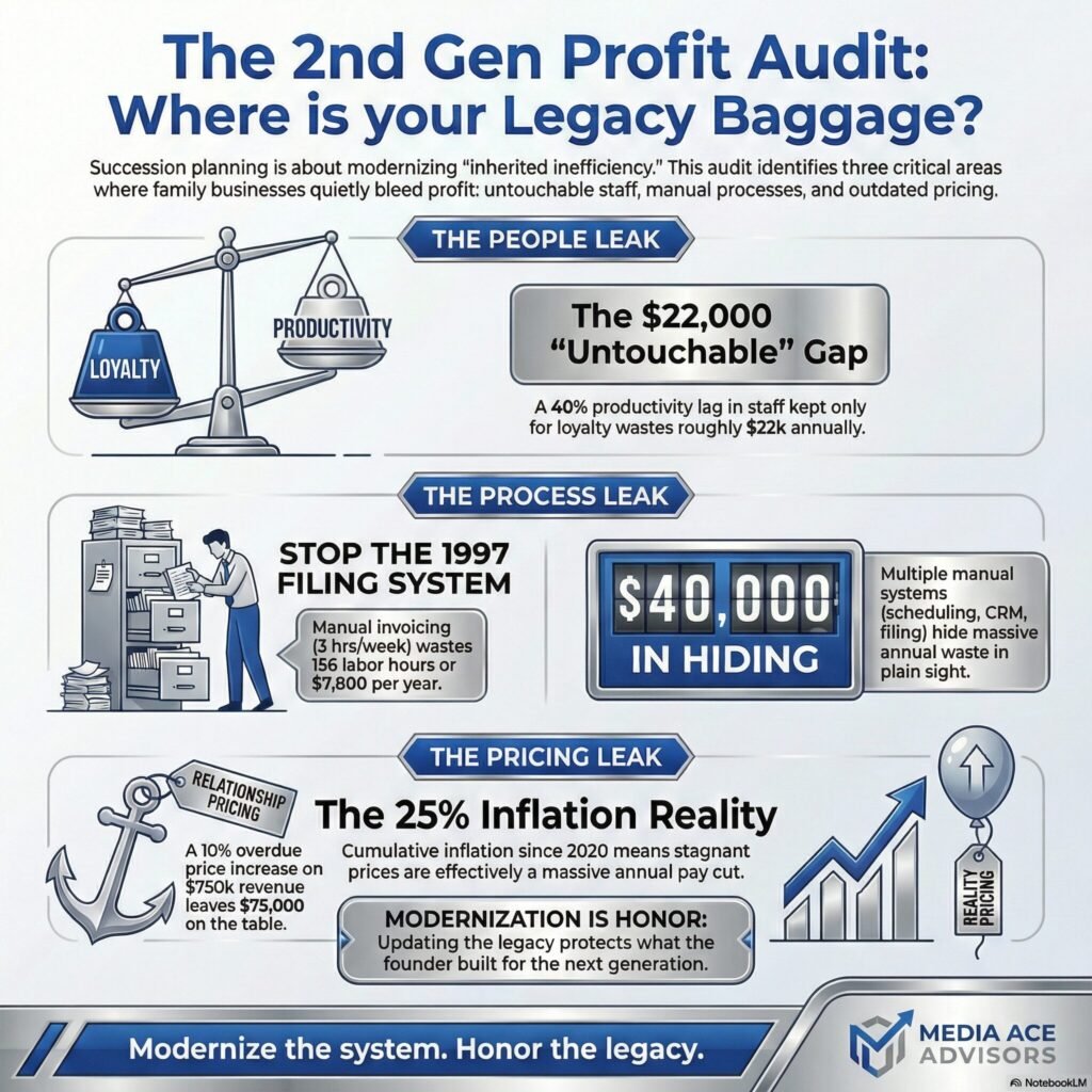 And here’s the pattern I keep seeing. Second-generation owners are some of the most capable people in business. But they’re fighting with one hand tied behind their back because of “legacy baggage” they didn’t create and don’t feel authorized to fix.